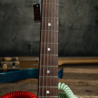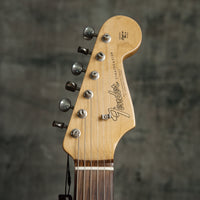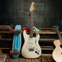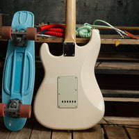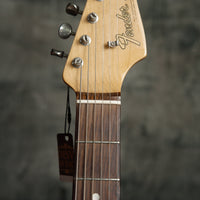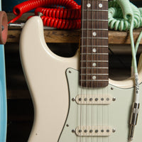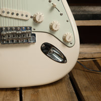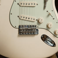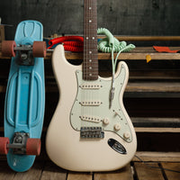 Featuring a solid alder body finished in Olympic White and a maple neck with a thick “’60s C” profile, this Strat offers authentic playability reminiscent of Fender’s golden era. The round-lam rosewood fingerboard with a 9.5″ radius and 21 vintage tall frets balances vintage feel with modern comfort.