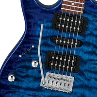 This model stands out with its Quilted Maple Art Grain top over a poplar body in a striking Transparent Blue Burst finish. A fast-playing maple neck and jumbo frets make it a great platform for modern rock and metal, while the Infinity pickup set (H-S-H) provides everything from thick humbucker drive to brighter single-coil textures via a 5-way selector. The T106 tremolo adds expressive vibrato options for lead work and surfy shimmer alike.