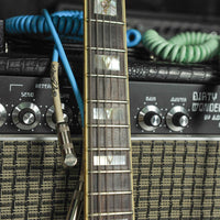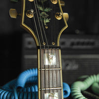 Gold hardware, ornate fretboard inlays, and multi-ply binding give this Sheraton II the upscale aesthetic that set it apart from other semi-hollows of its time. Built under Gibson’s oversight during the late ’80s, it reflects high-quality craftsmanship and attention to detail.