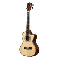 The Kala KA-SSEBY-T-CE combines refined craftsmanship with tonal versatility, offering a ukulele that looks as beautiful as it sounds. With its solid spruce top and striped ebony back and sides, this tenor model delivers a clear, balanced tone with rich projection and dynamic range — perfect for both strumming and fingerstyle.